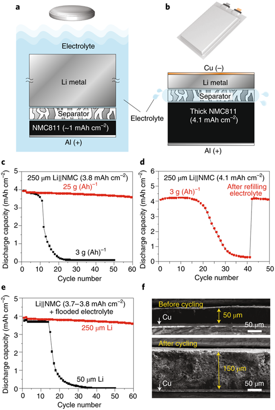 我們平時研究Li金屬電極時使用了成倍過量的鋰金屬和電解液,所得大多數(shù)研究結(jié)果中不能被放大應(yīng)用到實際的軟包電池中。對于以往研究的大多數(shù)可充放電扣式電池,其能量密度遠(yuǎn)小于50Wh/kg。如圖2所示,關(guān)鍵電池參數(shù),包括正極負(fù)載,電解液量和Li金屬量(厚度)都對電池循環(huán)性能有重要影響。除了其他非活性材料(如隔膜,集流體和包裝材料)外,還必須仔細(xì)選擇這些參數(shù),以獲得長循環(huán)高能實用電池。圖2:電池參數(shù)和電池壽命與Li負(fù)極形態(tài)之間的關(guān)系。a,實驗室扣式電池經(jīng)常使用成倍過量的Li和電解液。b,具有多層堆疊電極的高能軟包電池。c-e,具有不同電解液用量(c)的Li || NMC電池的循環(huán)性能,在原始貧電解液被消耗(d)之后補充電解液,電池的循環(huán)性能;不同厚度Li金屬(e)的Li || NMC電池的循環(huán)性能。紅色線代表軟包電池,黑色線代表扣式電池。f,循環(huán)后,Li金屬負(fù)極的厚度變化,開始采用的是厚度為50微米的Li。用于c-e的扣式電池在C/10倍率下循環(huán)2次進行化成,然后在2.7-4.4V的電壓范圍內(nèi)以C/3倍率循環(huán)進行充放電循環(huán)。