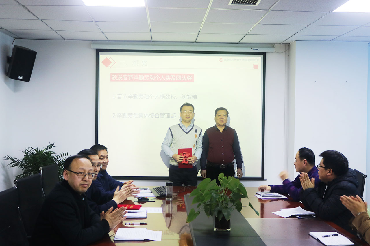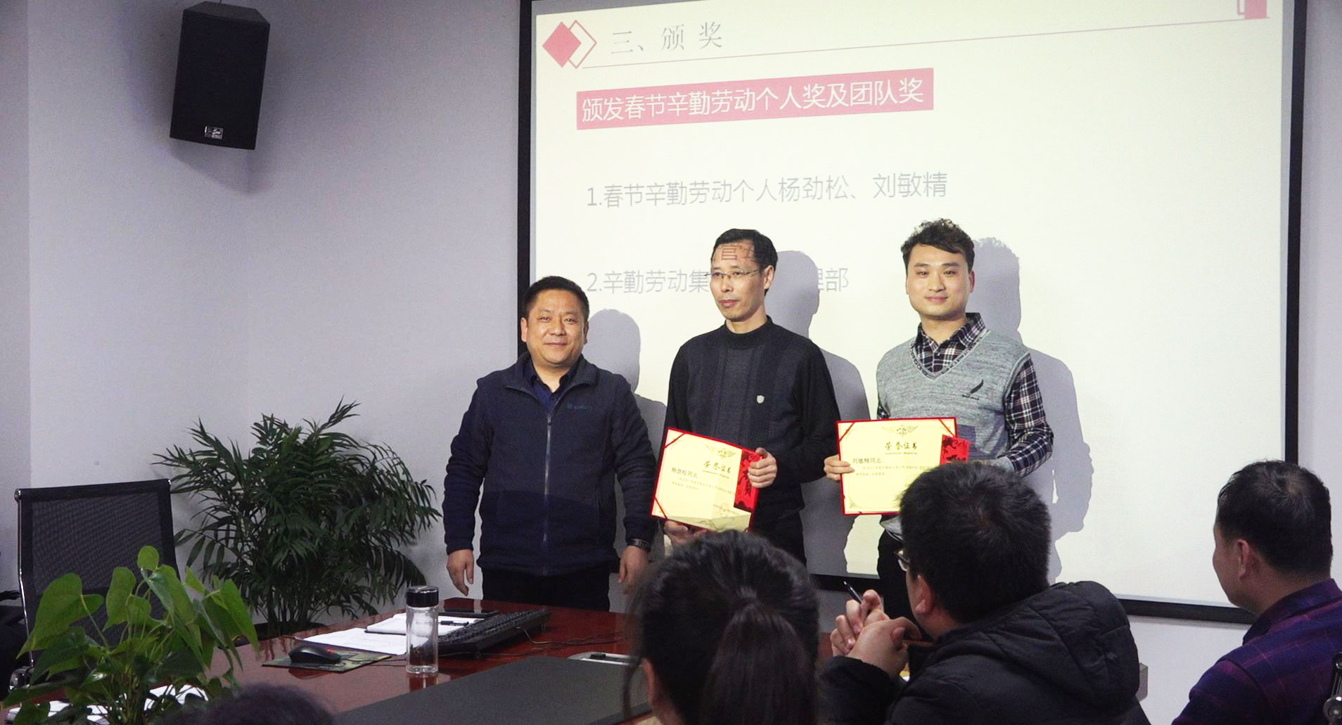 再次,公司對春節(jié)期間仍在崗工作和學習的研發(fā)部04項目總師楊勁松、綜合管理部人資主管劉敏精和辛勤勞動集體予以表彰,副總經(jīng)理楊利鋒給個人頒發(fā)榮譽證書和獎金。公司領(lǐng)導對綜合管理部予以表彰,表揚綜合管理部一直兢兢業(yè)業(yè)的為大家服務,配合項目工作,評為辛勤勞動集體;